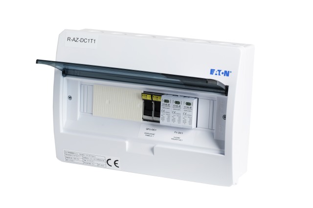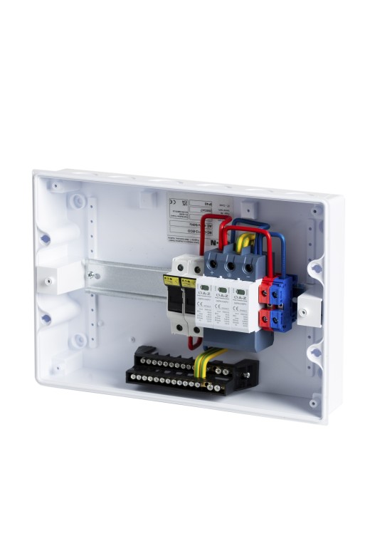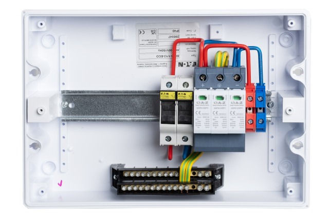 DC switchboard designed for wall mounting, IP40/20 serving as an input switchboard from photovoltaic panels (to the inverter) for the entire portfolio of photovoltaic power plants. Especially when using other switchboards, also EATON BC-O-1/12-ECO. Its advantage is its small size, the ability to "stack" with other AC switchboards next to each other or under each other, which makes it possible to install it even in areas where space is a problem. The switchboard is equipped with a DC surge arrester and fuse disconnectors including gPV fuses for securing the DC input to the inverter. Suitable for combining with switchboards for the AC part of the installation with those installed in EATON BC-O-1/12-ECO switchboards.